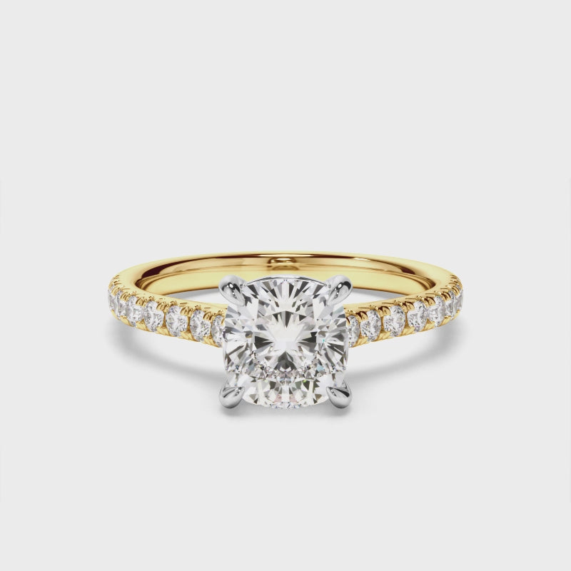 This timeless custom-made cushion cut diamond solitaire engagement ring, made with your choice of diamond centre stone, set in a half band of pave diamonds. Exuding fluidity in its line work, and boasting an elegant silhouette, as with all the pieces in our Bespoke Collection, this piece is made especially for you.