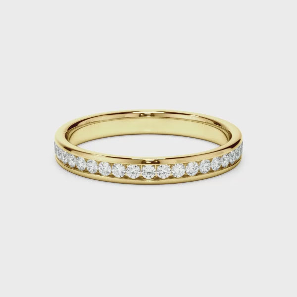 This stunning custom-made eternity wedding ring features a full band of round brilliant cut diamonds in an 18ct gold or platinum band. Exuding fluidity in its line work, and boasting an elegant silhouette, as with all the pieces in our Bespoke Collection, this piece is made especially for you.