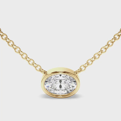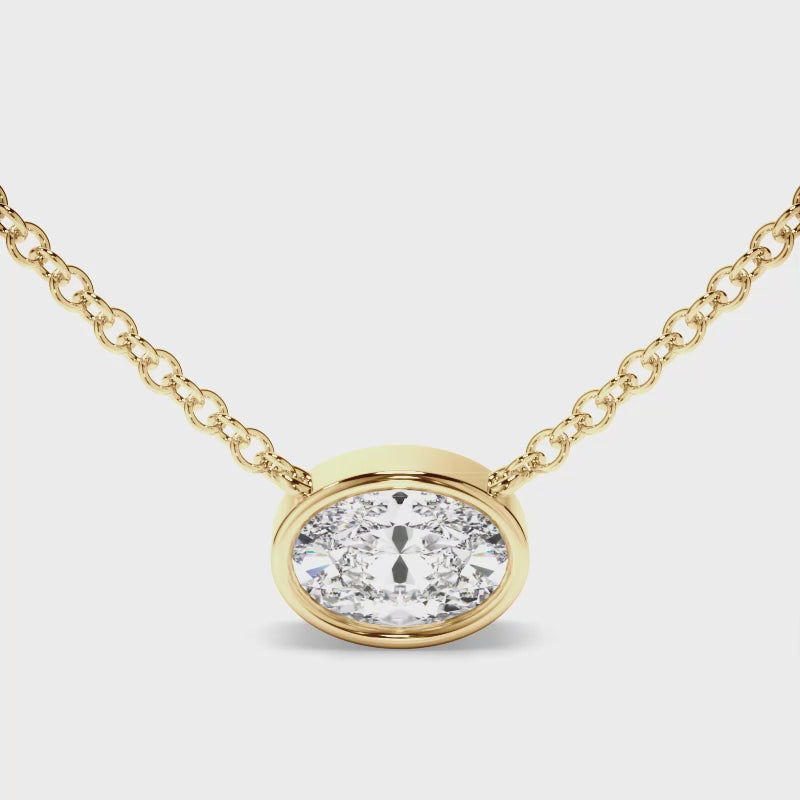 This elegant diamond bezel set solitaire necklet is made with your choice of diamond centre stone and includes a 45cm 18ct gold chain. Exuding fluidity in its line work, and boasting an elegant silhouette, as with all the pieces in our Bespoke Collection, this piece is made especially for you. Pictured here with a 1.50ct Oval Cut Diamond centre stone, a final price is determined following your centre stone selection.