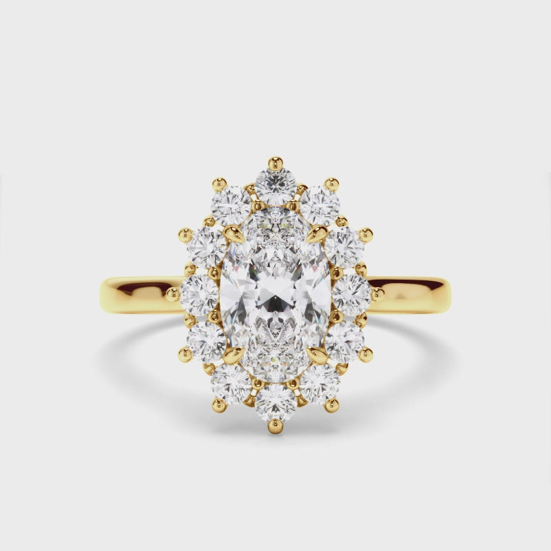 This timeless custom-made oval cut diamond engagement ring, made with your choice of diamond centre stone, features a diamond halo set in a classic half round band. Exuding fluidity in its line work, and boasting an elegant silhouette, as with all the pieces in our Bespoke Collection, this piece is made especially for you.