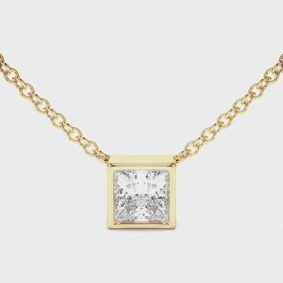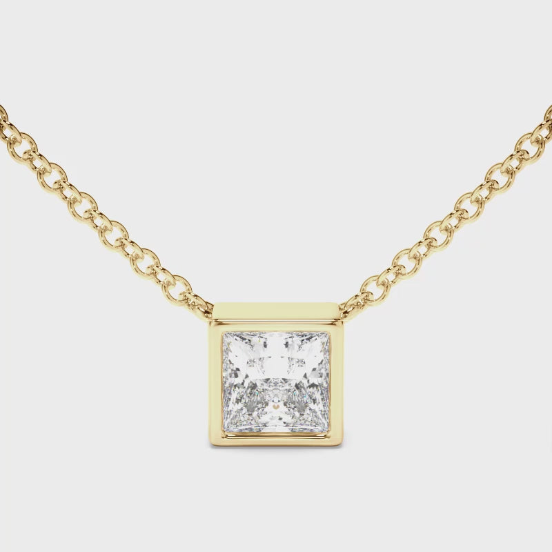 This elegant diamond bezel set solitaire necklet is made with your choice of diamond centre stone and includes a 45cm 18ct gold chain. Exuding fluidity in its line work, and boasting an elegant silhouette, as with all the pieces in our Bespoke Collection, this piece is made especially for you. Pictured here with a 1.50ct Princess Cut Diamond centre stone, a final price is determined following your centre stone selection.