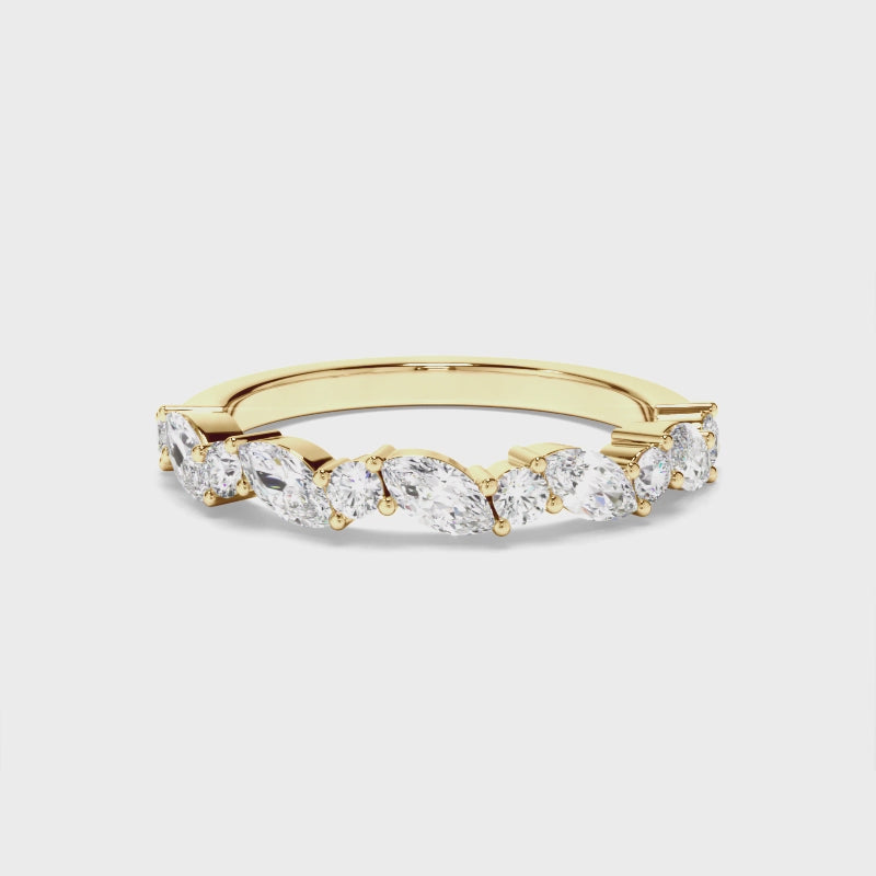 This stunning custom-made anniversary ring features a half band of alternating round brilliant and marquise cut diamonds set on an 18ct gold or platinum band. Exuding fluidity in its line work, and boasting an elegant silhouette, as with all the pieces in our Bespoke Collection, this piece is made especially for you.
